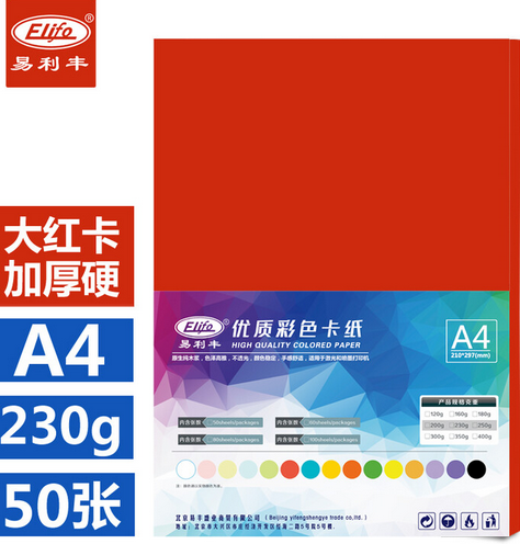 • 易利丰 a423050 喷墨/相片纸/卡纸 红色卡纸 硬230g打印纸红色a4纸加厚大红纸a4彩纸彩色纸儿童手工纸50张